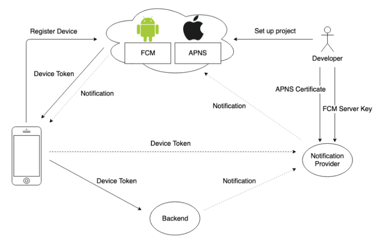3. 백엔드는 토큰을 유저 정보와 연동하여 DB에 보관하다가, 필요할 때 조회해서 Notification Provider에 푸시 알림을 요청한다.