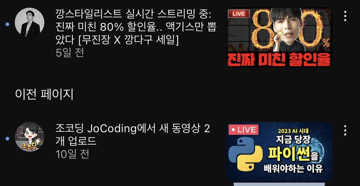 내가 구독을 누른 유튜버가 생방송을 시작하거나 새로운 영상이 올라왔을 때 다음과 같이 구독한 사람들에게만 푸시알림이 가는 것을 볼 수 있다.
