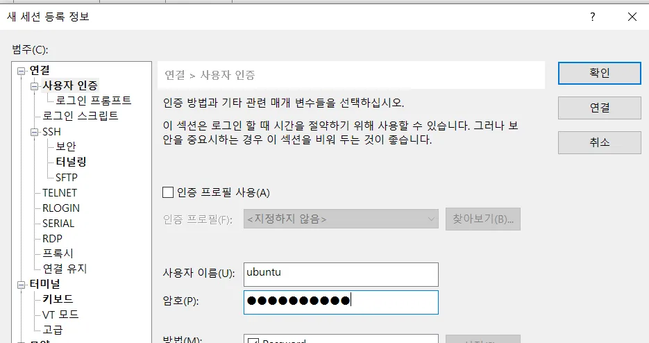 사용자 인증에서 자신이 입력했었던 사용자 이름과 암호를 입력해줍니다.