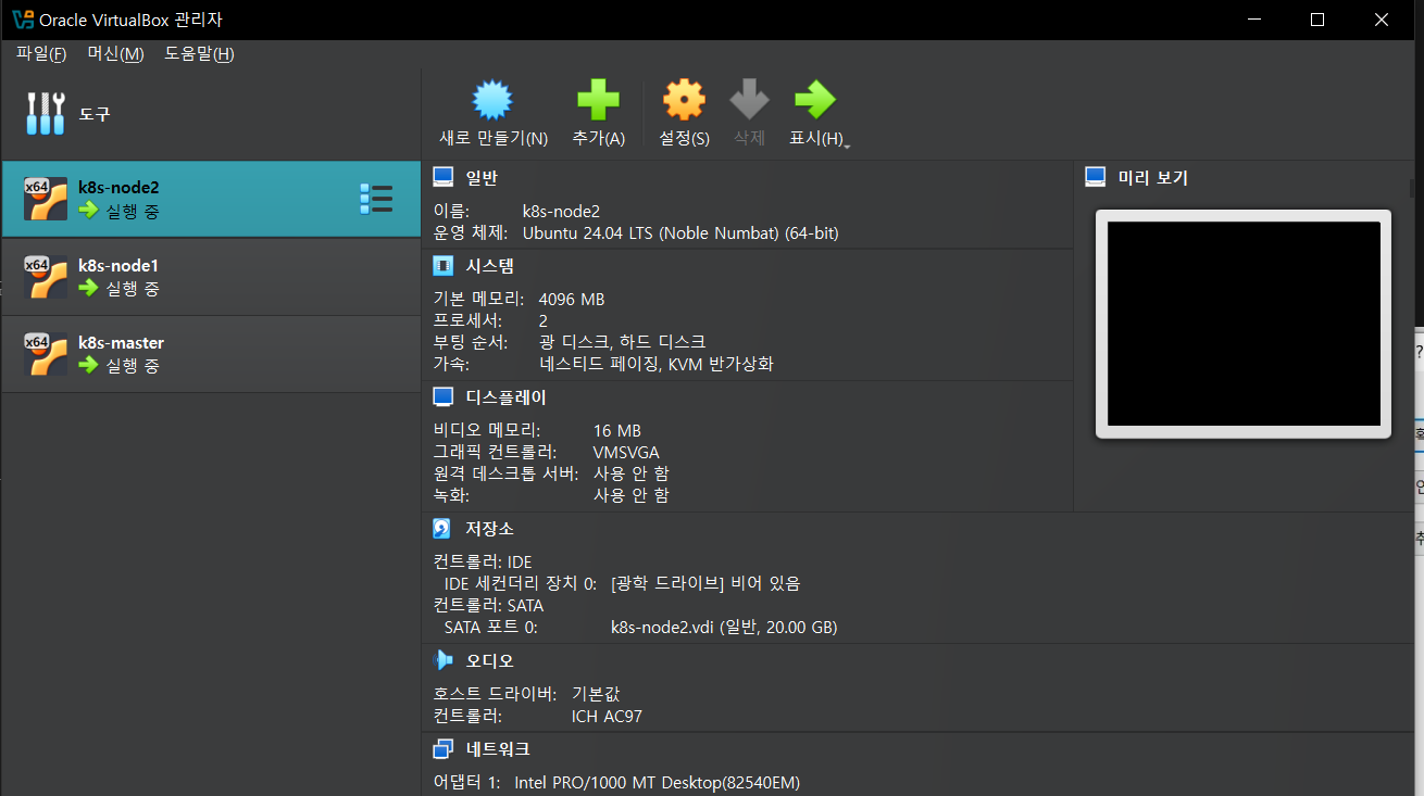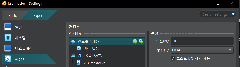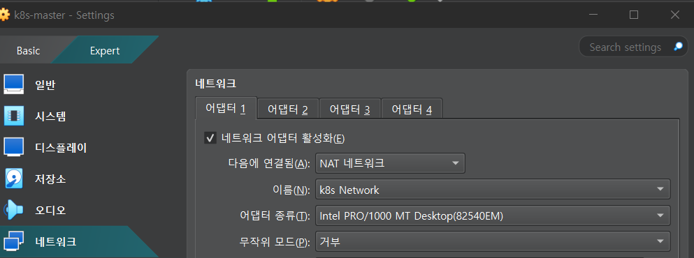 네트워크 탭에 들어가서 NAT 네트워크와 아까 설정한 k8s Network를 설정합니다.