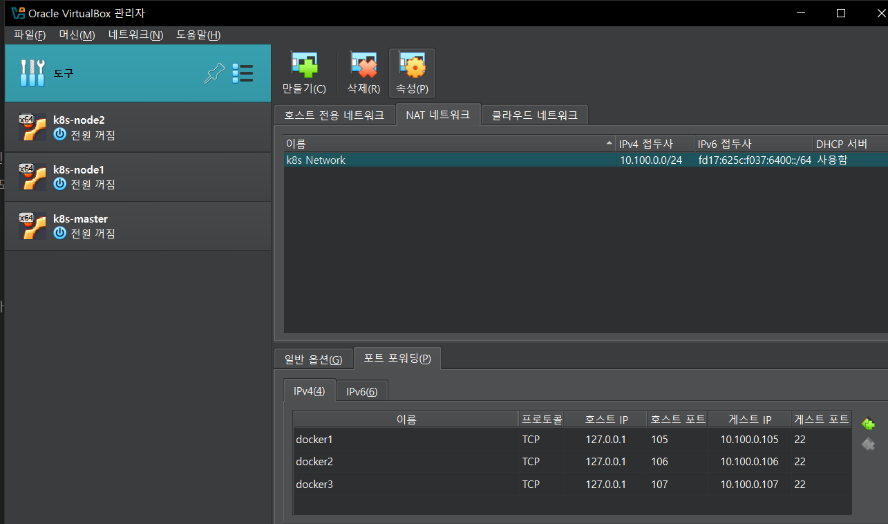 - 포트 포워딩 설정: NAT 네트워크는 기본적으로 외부에서 VM 내부로 직접 접근하지 못하게 막기 때문에, 호스트에서 각 VM으로 접근하려면 포트 포워딩이 필요합니다.