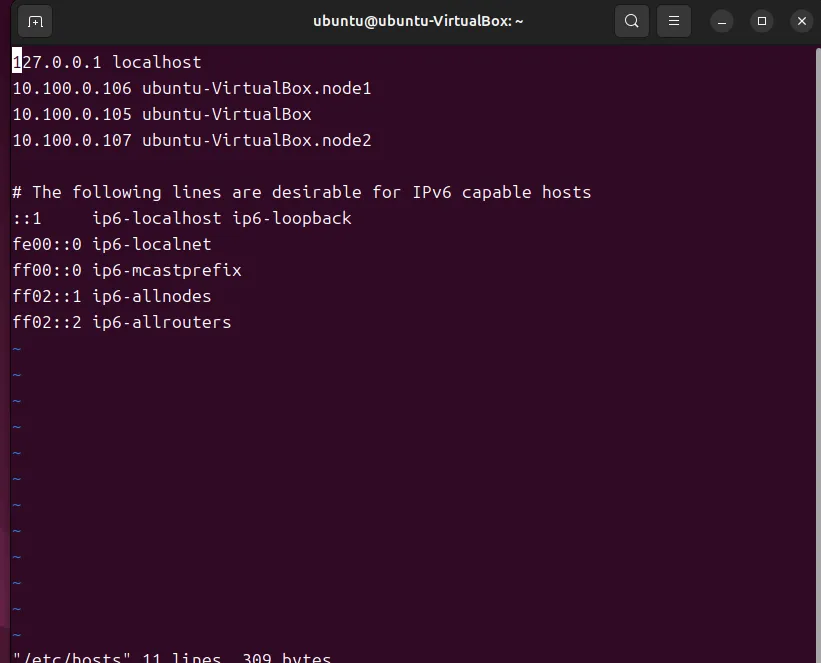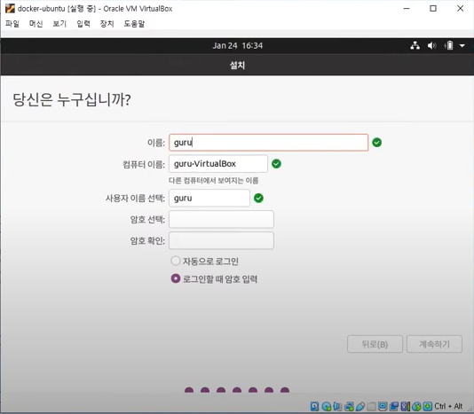 중간에 이런식으로 작성해주면 되는데, 저는 그냥 이름은 ubuntu, 컴퓨터 이름은 ubuntu-VirtualBox, ubuntu-VirtualBox.node1, ubuntu-VirtualBox.node2 이런식으로 3개 만들었습니다.