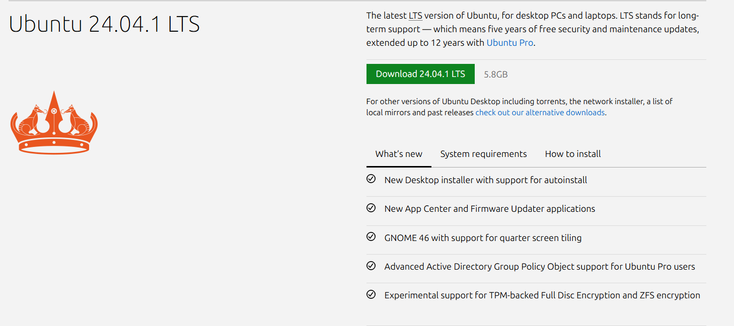저는 위 링크에서 다운로드를 진행했고, 제가 봤을 때, 가장 최신버전인 Ubuntu 24.04.1 LTS를 다운로드 받았습니다.