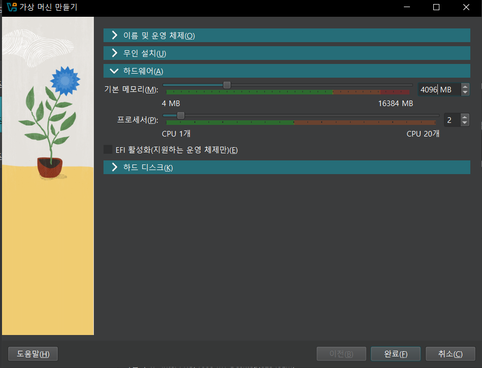 하드웨어 측면에서 제가 기본 메모리를 2048로 설정하고 진행했었는데 우분투를 다운로드 받다가 서버가 멈추는 현상을 발견했습니다.