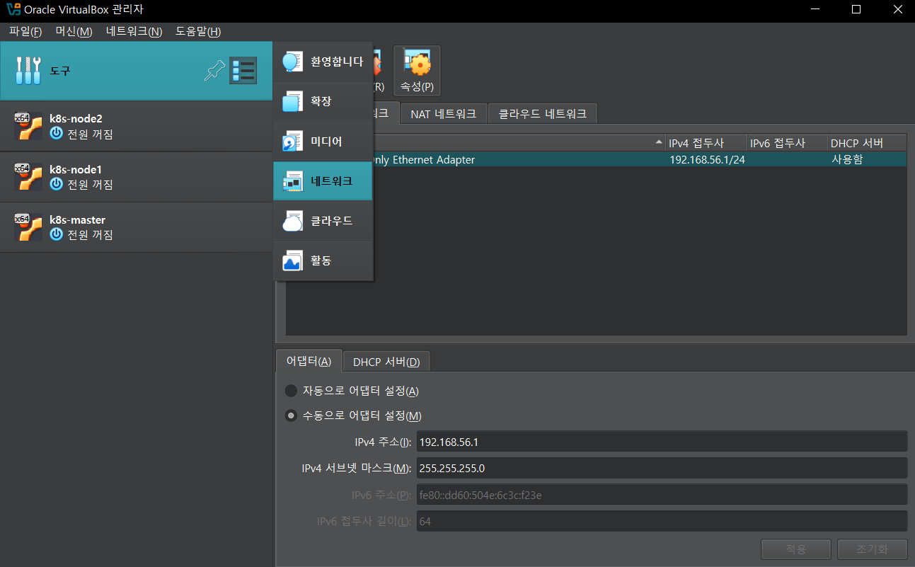 도구를 클릭하고 네트워크를 선택하여 k8s에서 사용할 네트워크를 만들어줍니다.