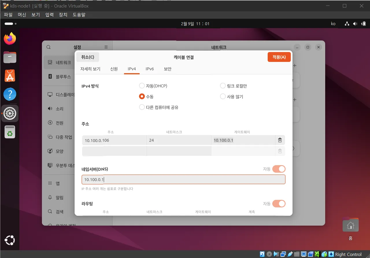 모두 완료되면 환경설정에 들어가 네트워크 부분에서 IPv4 수동으로 변경하고