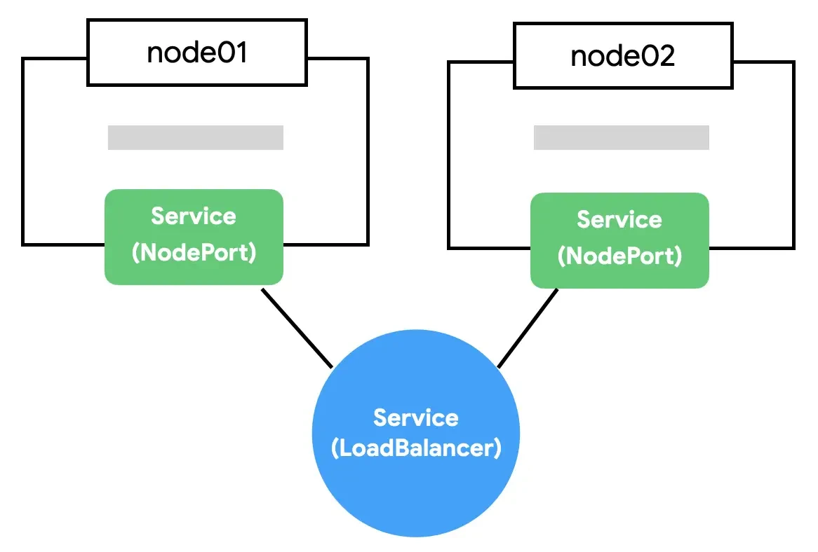 각 노드의 동일한 포트를 열어 외부에서 접근할 수 있도록 합니다. NodeIP:NodePort를 통해 클러스터 외부에서도 서비스를 호출할 수 있습니다. - LoadBalancer: